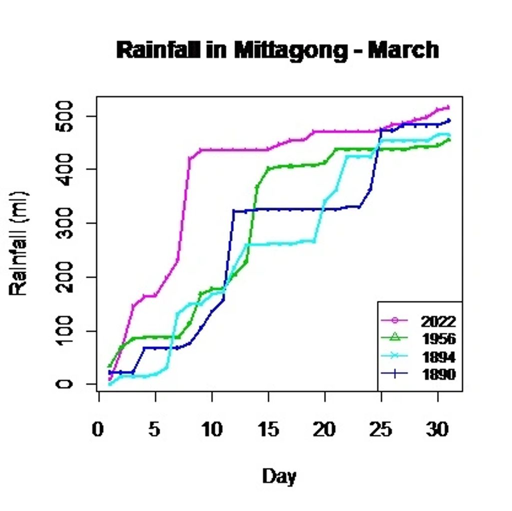 This plot shows the cumulative rainfall at Mittagong in March 2022 (purple), 1890, 1894 and 1956.. Refer to 'Mittagong rainfall report' in Downloads.